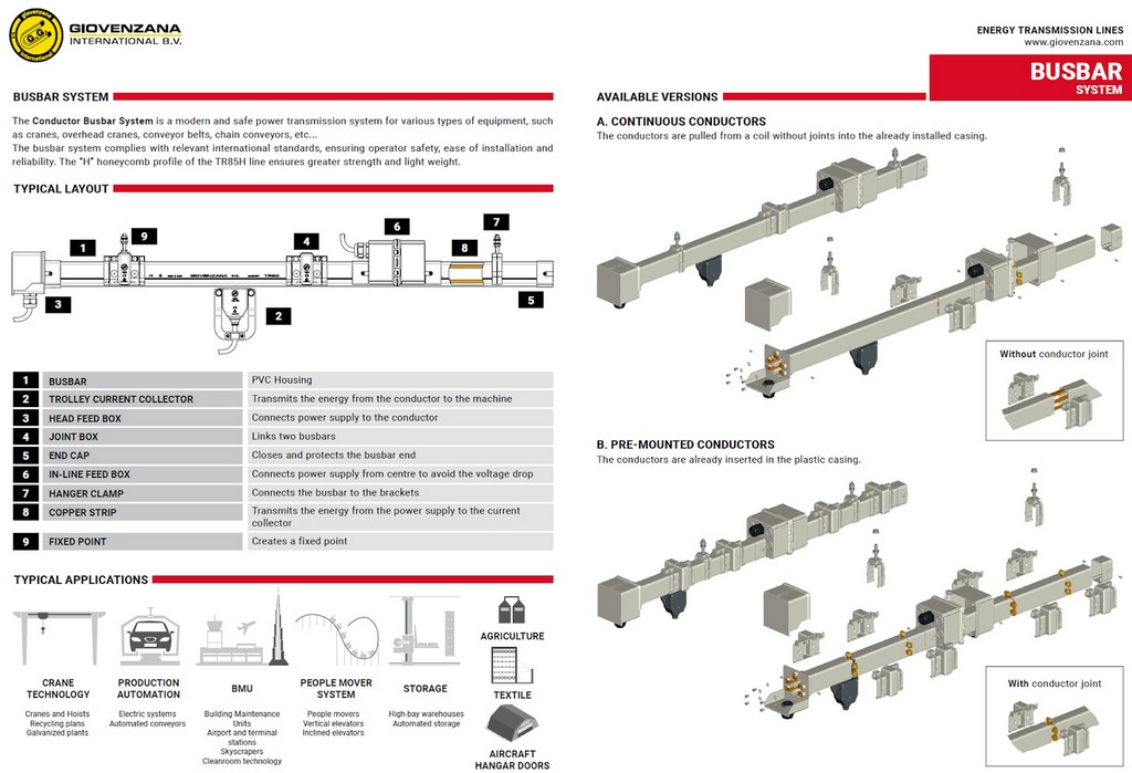 Giovenzana ponuja različne rešitve za prenos energije: Busbar linije, Multipole line in Festoon sistem.